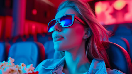 Young Woman Enjoying 3D Movie in Theater. Generative ai. High quality illustration
