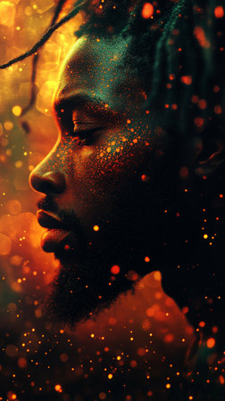 Portrait of a Bearded Man with Glasses, Intense Gaze Amidst Bokeh Lights, Moody Atmosphere