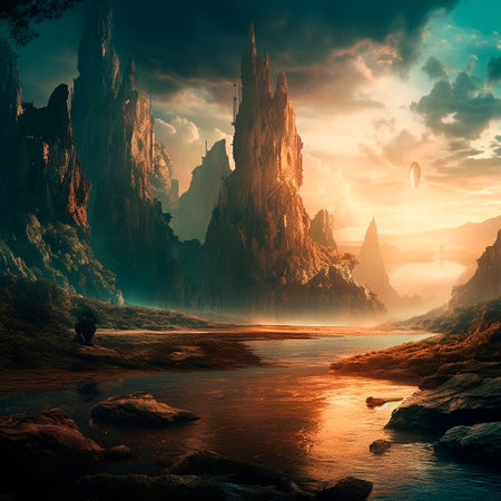 Surreal landscape with a colorful sky, mountainous formations, and a body of water.