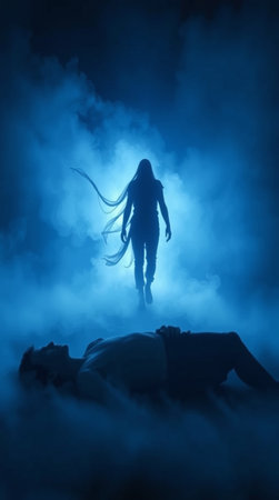 Silhouette of a person lying on the floor in a foggy room