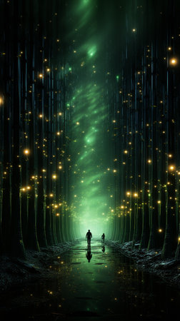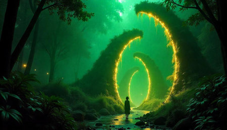 Ethereal forest with luminous portals and solitary figure