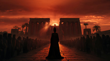 Silhouette of a woman standing in front of an ancient temple