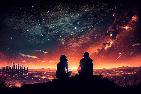 Couple looking at the starry sky. High quality illustration