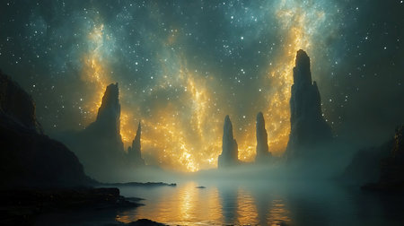 A striking cosmic landscape showcases tall rock formations illuminated by a golden glow against a starry night sky. The calm water reflects the ethereal scene, creating a serene atmosphere.