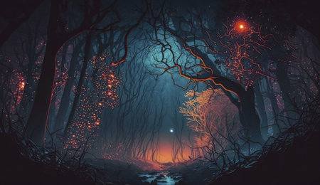 Fantasy of neon forest glowing colorful like fairytale. (Created with Generative AI technology).