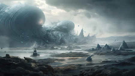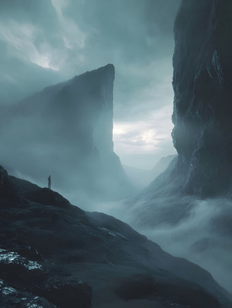 Figure on a cliff overlooking waves in a gloomy, mysterious, and atmospheric landscape. Lone figure standing on a cliff edge facing a dark, misty sea