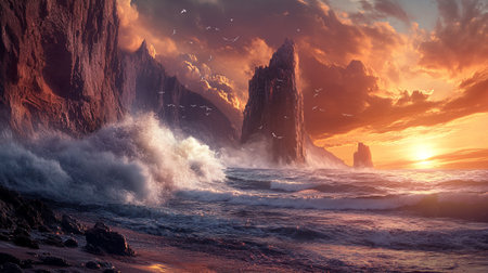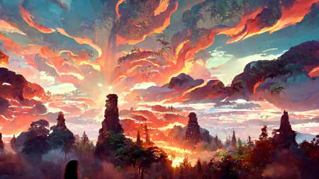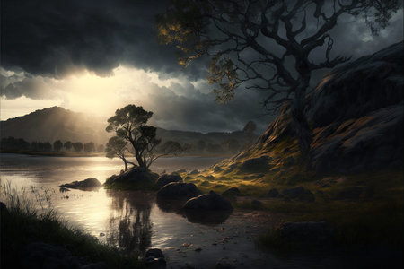 Dramatic Landscape Illustration with cloudy skies and beautiful sunset nature illustration. Cinematic dramatic nature scenery. Ai generated