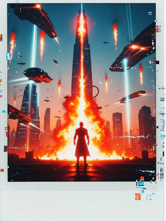 Apocalyptic Cartoon Illustration. Science fiction concept. Abstract spaceship background. Cyberpunk poster on a yellow background.