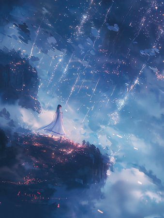 A lone figure stands atop a misty mountain, overlooking a vast and mysterious valley. The scene evokes a sense of serenity and awe.