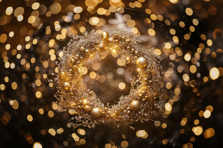 Gold holiday wreath with sparkling lights and glittering ornaments against bokeh background, creating festive and glamorous celebration atmosphere.