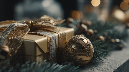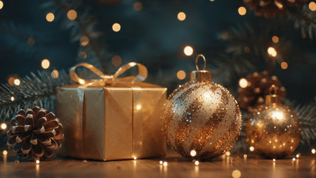 Close-up of sparkling golden Christmas ornaments, creating a festive and luxurious atmosphere. Perfect for holiday cards.