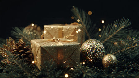 A top-down view of a beautiful Christmas flat lay with presents, fir branches, and shiny balls, providing ample space for a festive message or creative design.