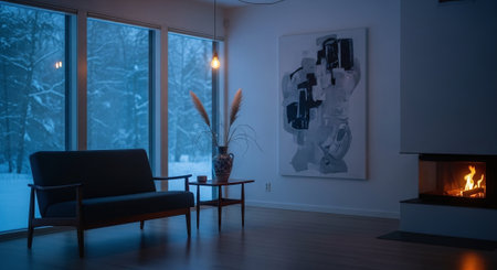 Interior of a cozy living room with a big window in winter