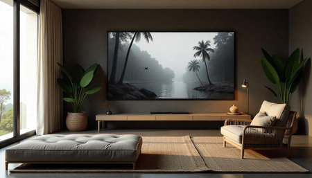 Elegant living room interior with tropical artwork and plants