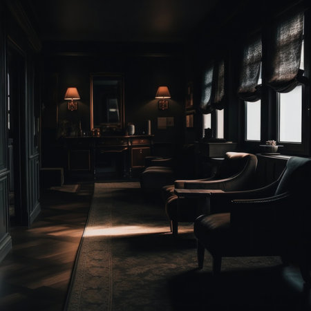A dimly lit room with two chairs and a desk. Generative AI image.