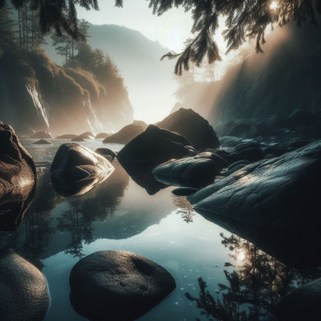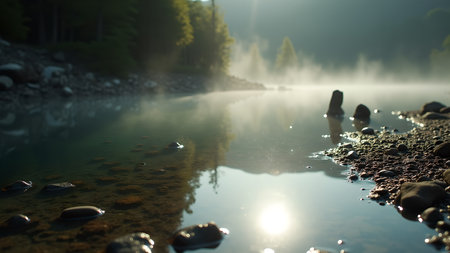 A beautiful morning scene of a misty river with sun reflections, with rocks and the surrounding forest, creating a serene atmosphere