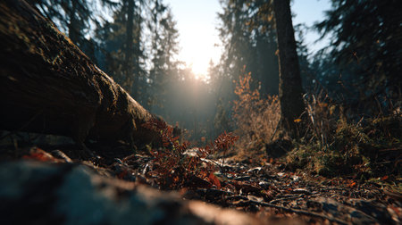 A serene forest scene captures the beauty of sunlight filtering through tall trees, revealing fallen logs and lush greenery, embodying tranquility and nature's splendor.