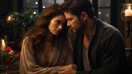 A man and a woman sitting at a table with candles, AI