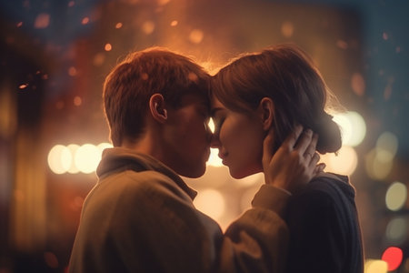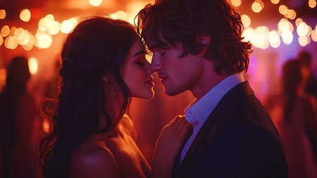 A man and woman kissing each other in front of a lighted background, AI