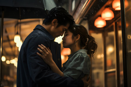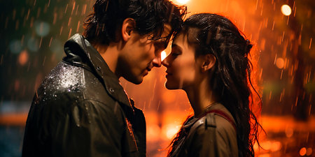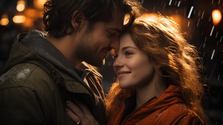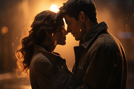 A couple embracing in the rain at night, AI