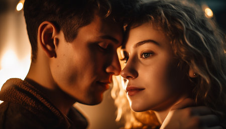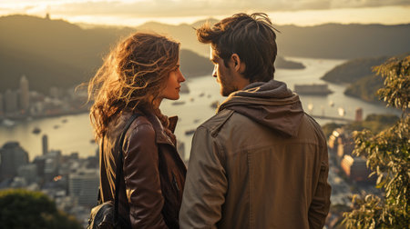 Young couple embracing outdoors, enjoying dusk and each other company generated by artificial intelligence
