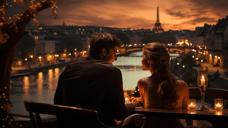Romantic couple sitting at a table in Paris with Eiffel Tower in the background,Generative AI