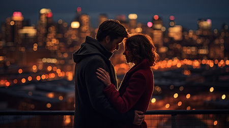 Romantic couple sharing a moment against a vibrant sunset skyline in the city at dusk. Generative AI