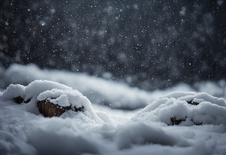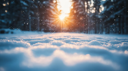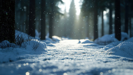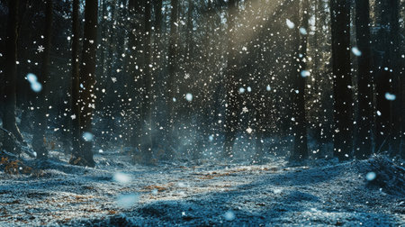 A stunning display of sparkling snow set against a backdrop of gently falling snowflakes and a serene forest, capturing the enchanting beauty and tranquility of winter, perfect for nature photography, seasonal projects, and peaceful designs.