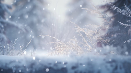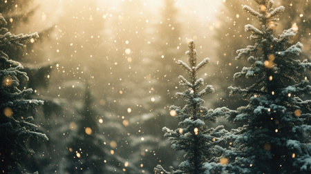 blur pine forest white snow falling background. festive winter seasonal Christmas and new year decoration concept. generative AI