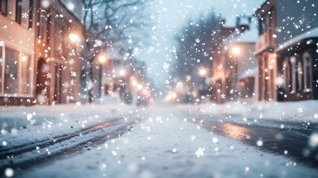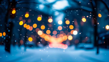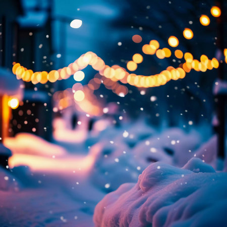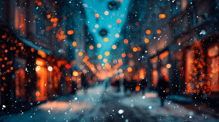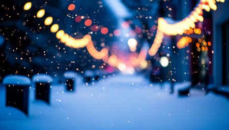 A cozy winter street scene filled with soft snowfall and vibrant bokeh lights. This serene setting captures the essence of festive joy and warmth during the holiday season.