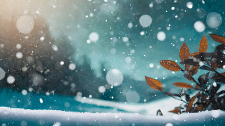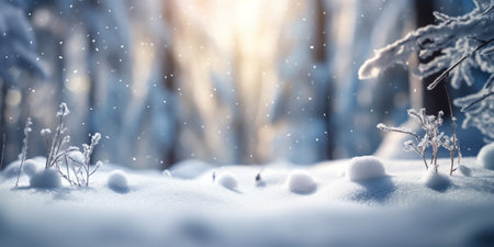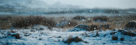 Snowflakes gently blanket a snow field in focus, evoking tranquility and beauty amidst the falling snow, banner