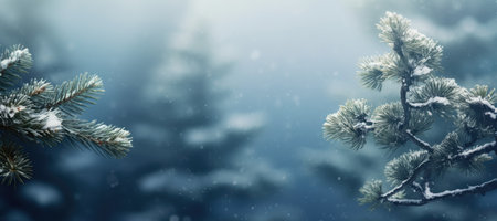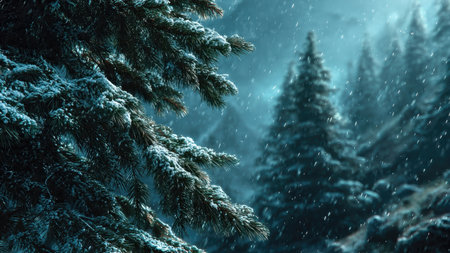 Snow falling on a pine branch in a winter forest. Peaceful and serene winter scene.