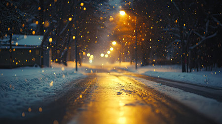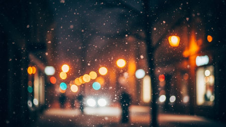 A blurry winter night scene on an urban street with falling snow and soft, glowing orange streetlights creating a...