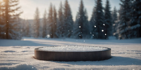 AI Generated. crystal clear podium for product display and presentation pedestal to showcase your product winter landscape background