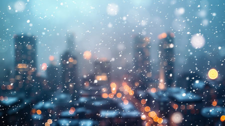 An ethereal scene with a defocused dreamy cityscape adorned with ling lights and a soft blanket of snow creating a captivating winter wonderland for all to enjoy.