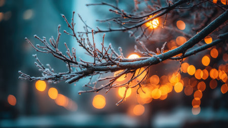 This captivating winter scene portrays frosted branches adorned with shimmering lights, evoking a tranquil atmosphere in the city at dusk.