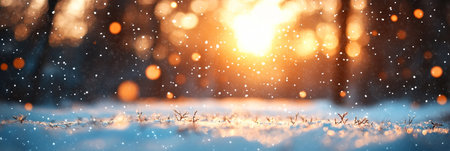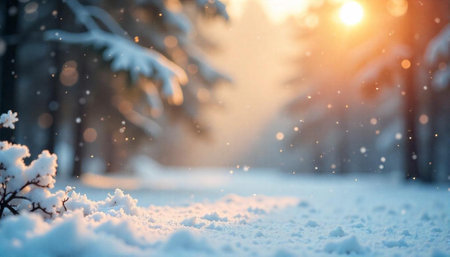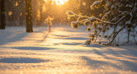 Soft mounds of snow in the foreground catch the warm glow of golden hour sunlight filtering through trees, with a string of festive lights blurred in the...