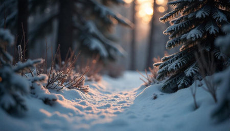 Snowy winter forest path at golden hour sunset