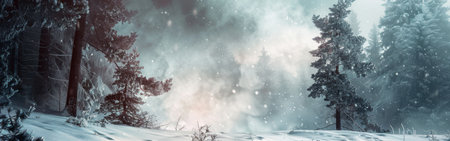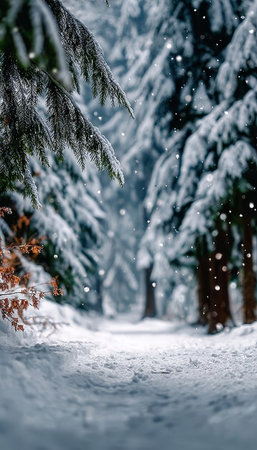 Serene Snow-Covered Forest in Winter Wonderland, Enchanting Snow Shower Amidst Tranquil Landscape