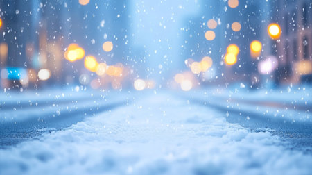 Snowy city street at night with snowflakes, bokeh and lights