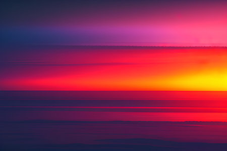 A stunning digital artwork of a vibrant sunset over a calm ocean, featuring a large, glowing sun and dramatic, colorful clouds. The intense colors create a mesmerizing and tranquil scene.. AI Generation