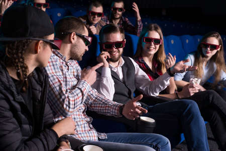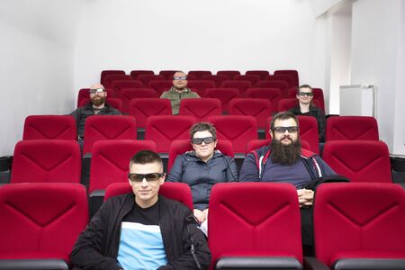 Friends are watching a movie in the cinema. People sit in the armchairs of the cinema and look at the screen with special glasses for 3D