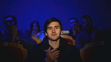 Young man is watching concert and applauding. Media. Young man is watching theater concert. Performance of play with applauding audience