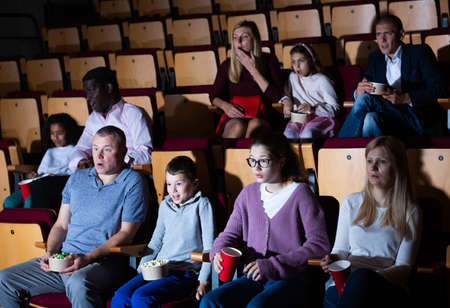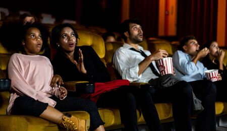 Taking seats in the cinema before watching a movie. Family day out. Day off.