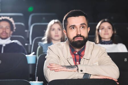 Side view portrait of young people watching movie in cinema while sitting in row on red velvet chairs, focus on man drinking soda through straw with tense face expression, copy space