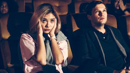 Caucasian man and woman watching a sad movie and his girlfriend crying