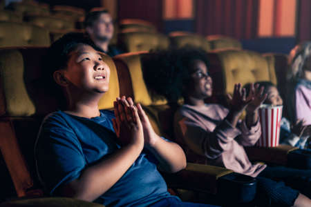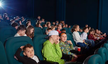 Sideview of boys watching movie in the cinema. There are other people wearing colorful clothes on background. They laughing, smiling, eating popcorn and drinking cola.