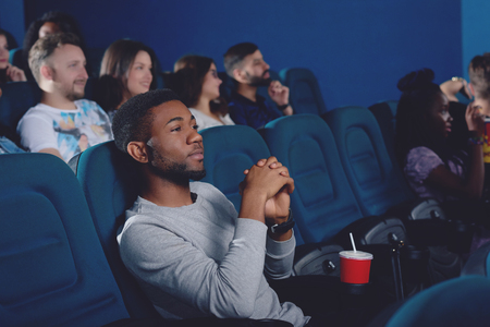 Selective focus shot of young Black man wearing protective mask spending time watching movie at cinema, pandemia concept