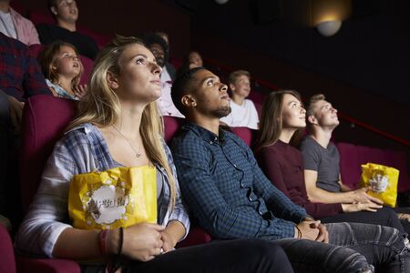 Young Couple In Cinema Watching Film And Eating Popcorn
