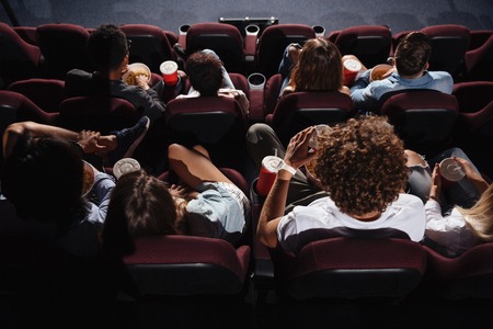 People audience watching movie in the movie theater cinema. Group recreation activity and entertainment concept.